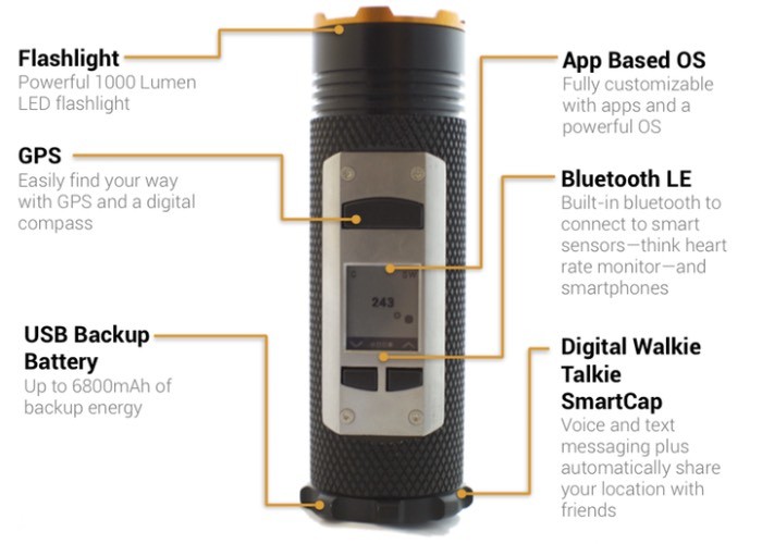 Գեղեցիկ պատյանի վրա կա պոքրիկ էկրան,GPS հաղորդիչ,6800մԱչ մարթկոց USB ելքով,թվային ռադիոկայան և Bluetooth LE ադապտեր: